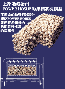 另外POWER HOUSE也有不容易阻塞的特性,所以能減輕過濾裝置內馬達運轉的負擔,節省電源。 |